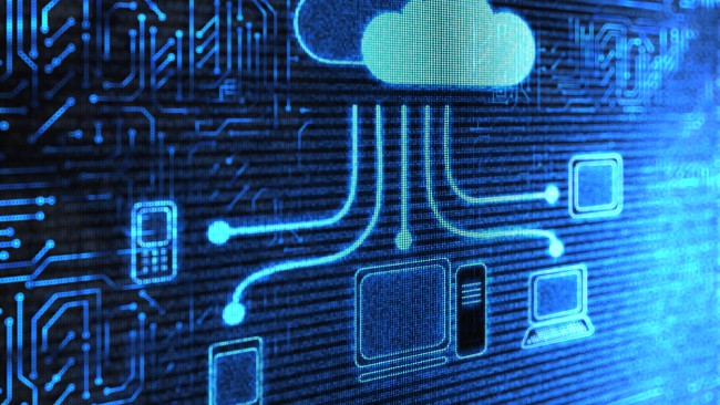 Close up shot of a blue digital screen, a graphic of a cloud with lines connection to different internet based devices